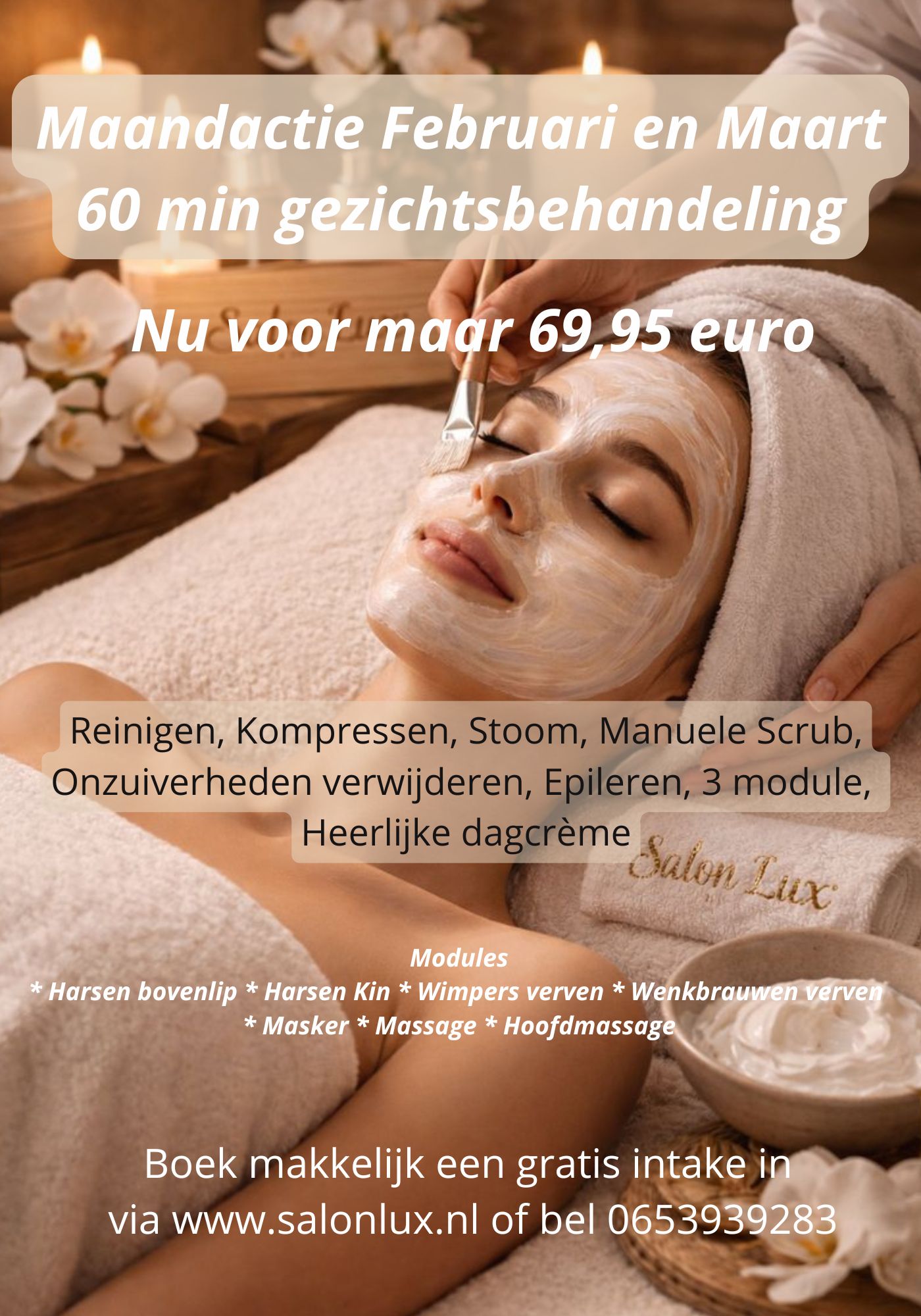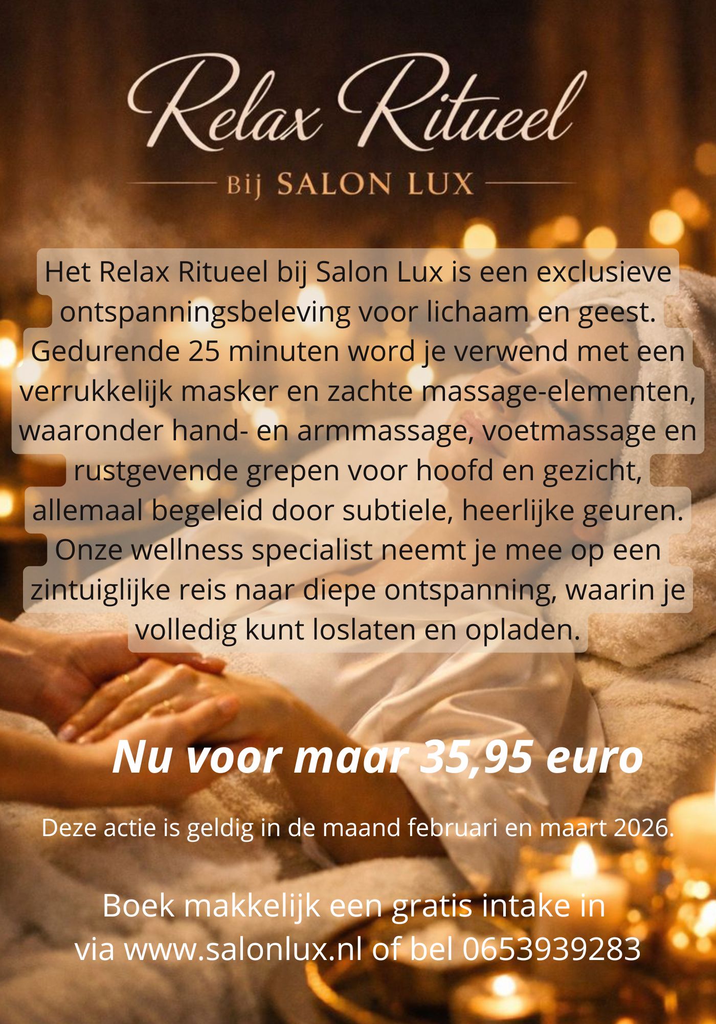 Bent u op zoek naar rust en ontspanning? Dan verwelkomen wij u graag in onze wellness salon, en laten wij u genieten van een weldadig gevoel en ontspanning. Salon Lux biedt u het beste op het gebied van persoonlijke verzorging voor een betaalbare prijs. Bij Salon Lux werken wij uitsluitend met producten van topkwaliteit. Boek makkelijk een afspraak via onze website en ervaar het zelf. Ook zijn de mannen bij ons van harte welkom. Maandactie!Boek makkelijk online via het kopje maandactie